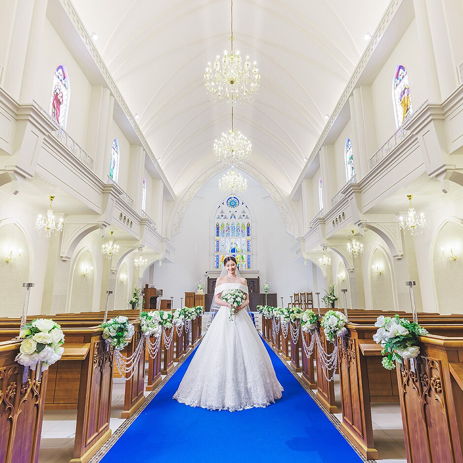 チャペルの扉を開けた瞬間に目を惹く真っ青なバージンロードには、ふたりの愛が海のように「永遠に続くように」という意味が込められている。母からのベールダウン、父とのバージンロード入場では思わず涙する事も。