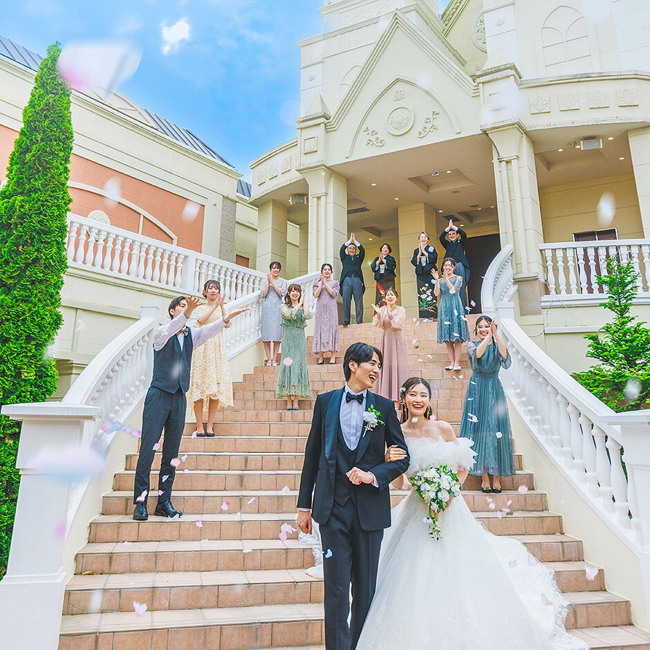 挙式後はチャペルから続く大階段でフラワーしシャワーで祝福を浴びて! -