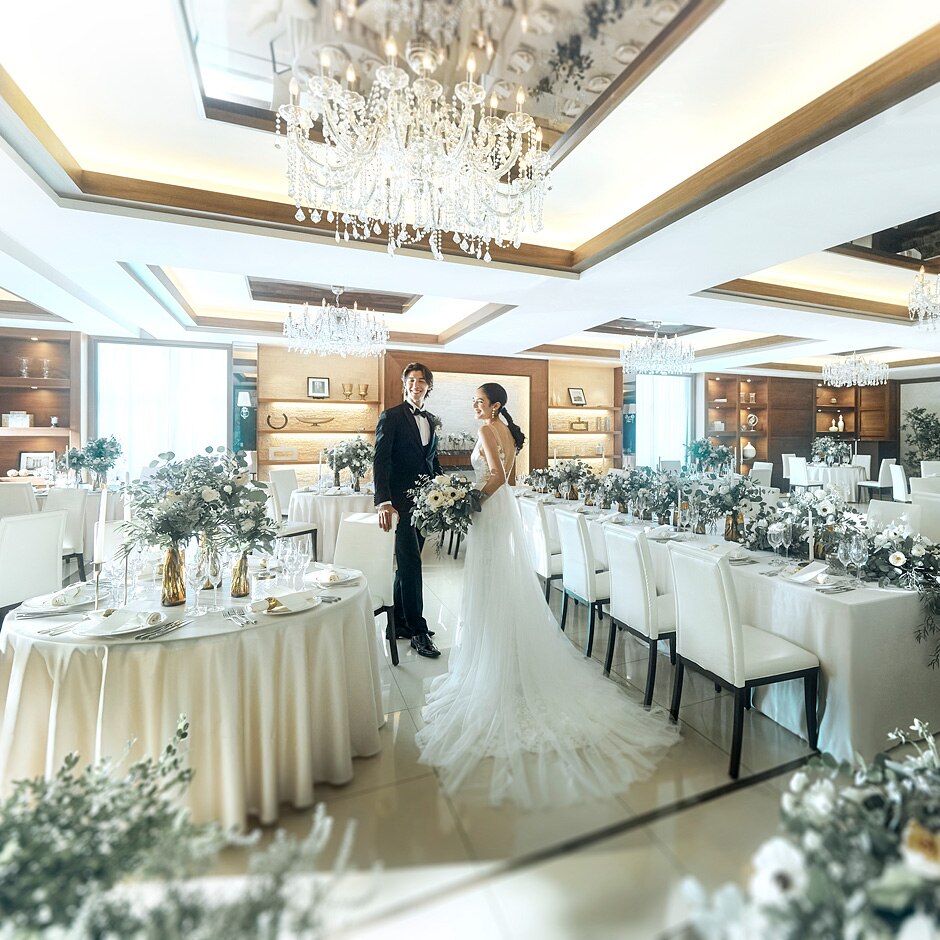 【アルマリアン】どんなコーディネートとも相性のよい白基調の会場を二人らしさで染め上げて
