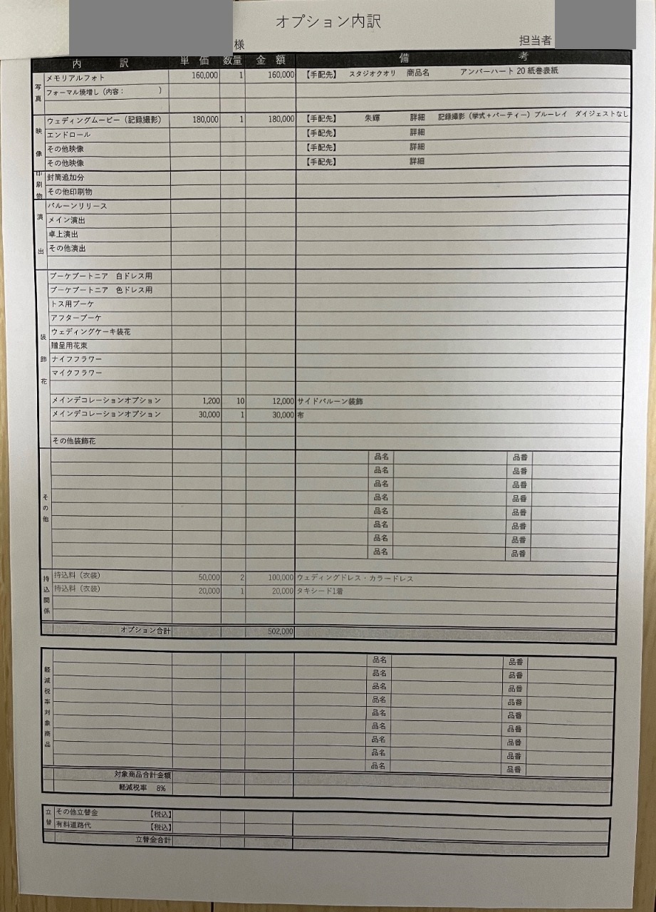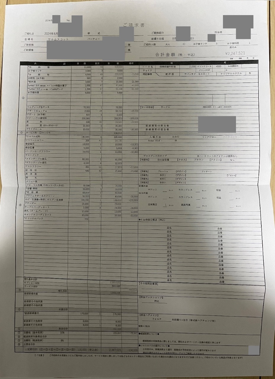 ナイトウエディングで全体的に値引きが多かったようです。初期の見積もりから可能な限り手作りや自己手配にして持ち込みしたため見積もりからなくなり式場への支払いは抑えられた方だと思います。ドレスはこだわりがあったので持ち込み料を支払い、持ち込みをしました。ほとんど持ち込み料がかからずこだわりながら節約も出来てよかったです。