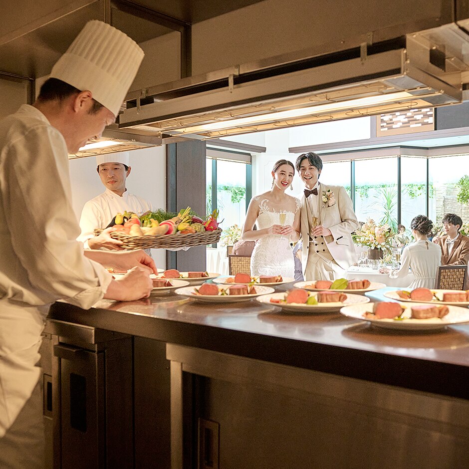 料理は、ゲストへの「ありがとう」の気持ちを伝えるためのもの。食材を厳選し、仕込みもじっくり時間をかけ、当日はパーティの進行やゲストの食事の進み具合をみながら、オープンキッチンで調理し提供している