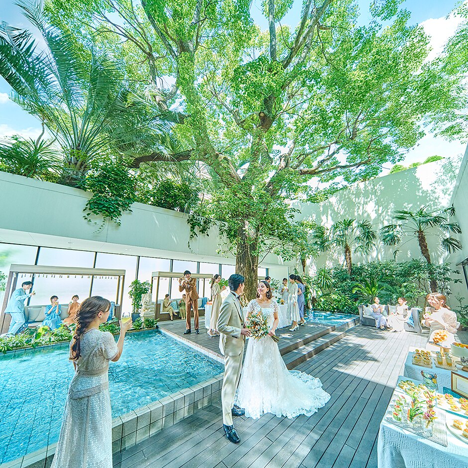 会場に隣接するガーデンは光と水、緑に包まれ、まさにふたりとゲストのライベートリゾート。樹齢300年を超えるシンボルツリーの下で、ゲストをおもてなし