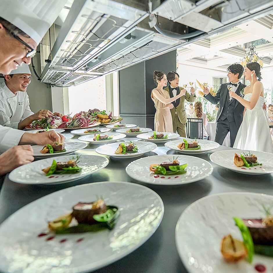 【お料理のおもてなし】料理重視に◎!会場内オープンキッチンよりシェフが目の前で調理する姿に期待も膨らむ!ご試食後にはシェフと直接相談で料理のこだわりをチェック!都内口コミ*高評価の料理を実感できる!