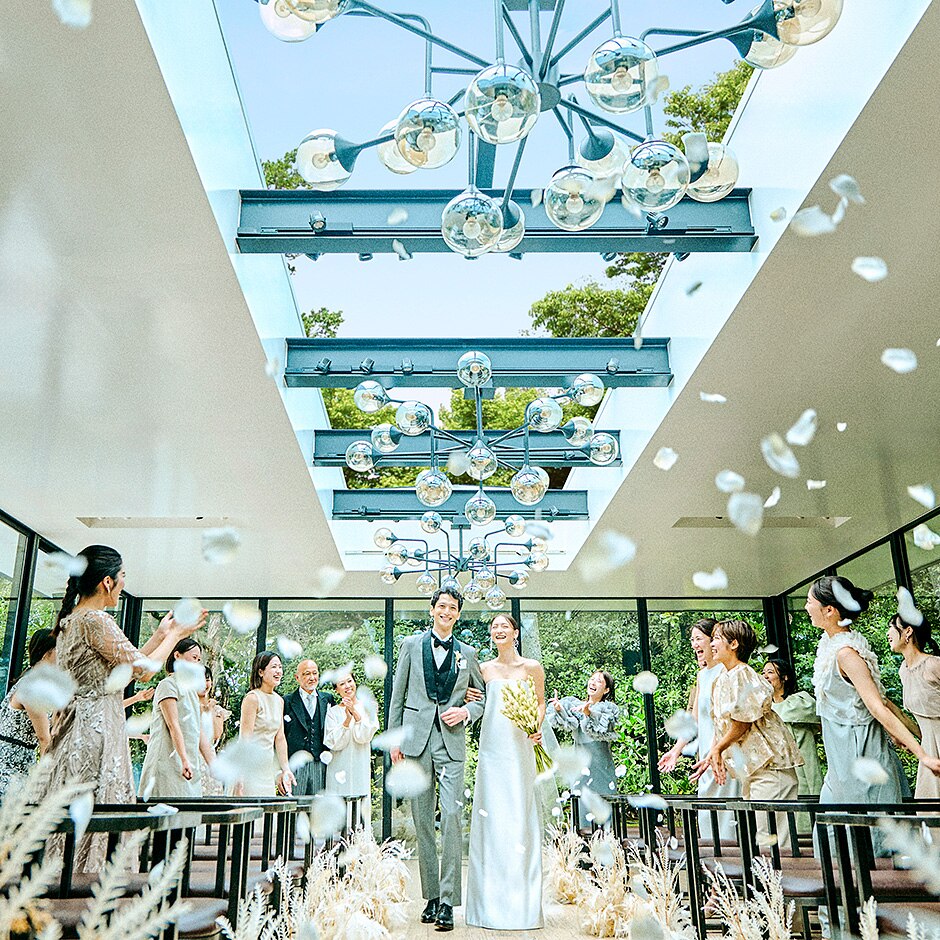 感動的な挙式の後は、青空の下でたくさんのゲストに見守られる中、笑顔溢れるフラワーシャワーの演出を。