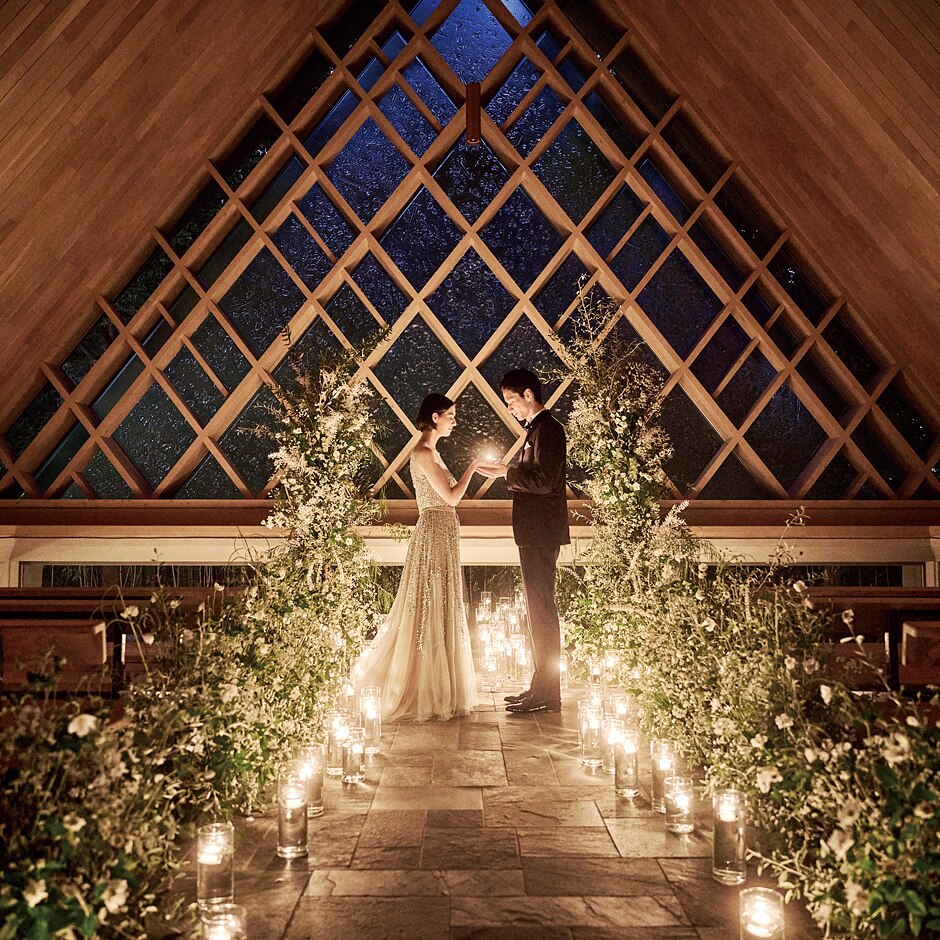 夜のチャペルは、デイタイムとは一味違った雰囲気に。ふたりが幻想的に映し出される。