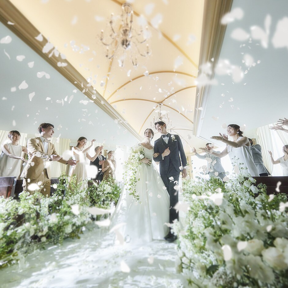 どんな色にも自由に染まる純白のチャペル。トレンドのアイルランナーを敷けば、ナチュラルテイストがお好みのおふたりにもぴったりの空間に