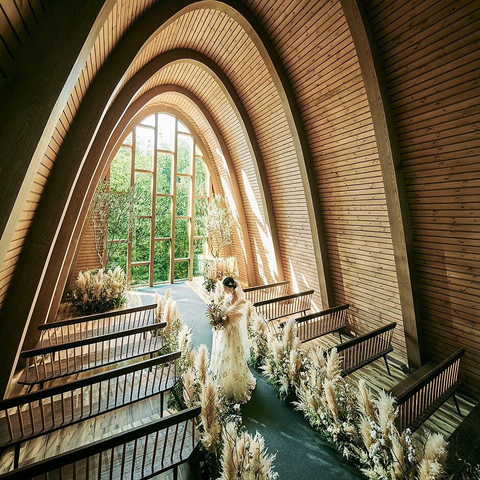 すべてに本物の木を贅沢に使用した、本格的な木造建築の挙式会場。正面には緑を望み、ナチュラルなコーディネートやインテリアからも癒しを感じる。自然が見守る穏やかな雰囲気に包まれた人前式で特別な誓いを叶えて