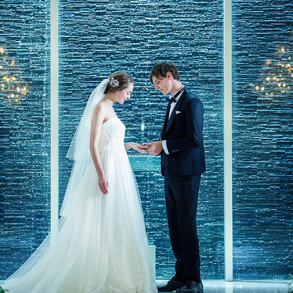 ふたりにとって大切な儀式だからこそ天候の影響を受けず癒しと感動を感じさせるチャペル。ブラックウォーターウォールは花嫁とドレスのディテールまで鮮やかに際立たせる。