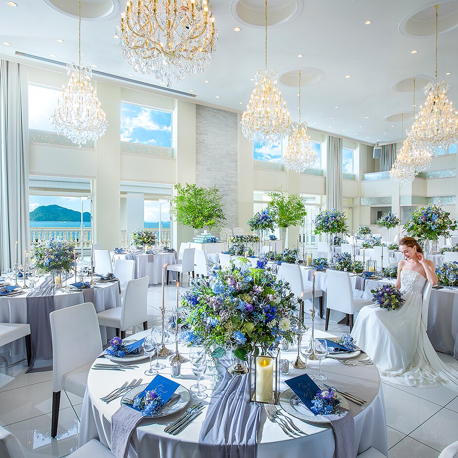 海と空、島々、行き交う船…緩やかに流れる時を映すパーティ会場。窓いっぱいの自然光の輝きが、開放感と上質感をプラス。華やかな大階段入場や、照明を駆使したサプライズなど多彩な演出を用意。