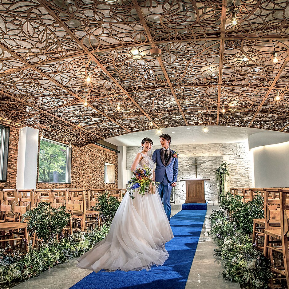 【森のチャペル】天然木のあたたかみをいかしたナチュラルなチャペル。 木と陽光に包まれながら、ゲストとの絆を実感できるアットホームな誓いを