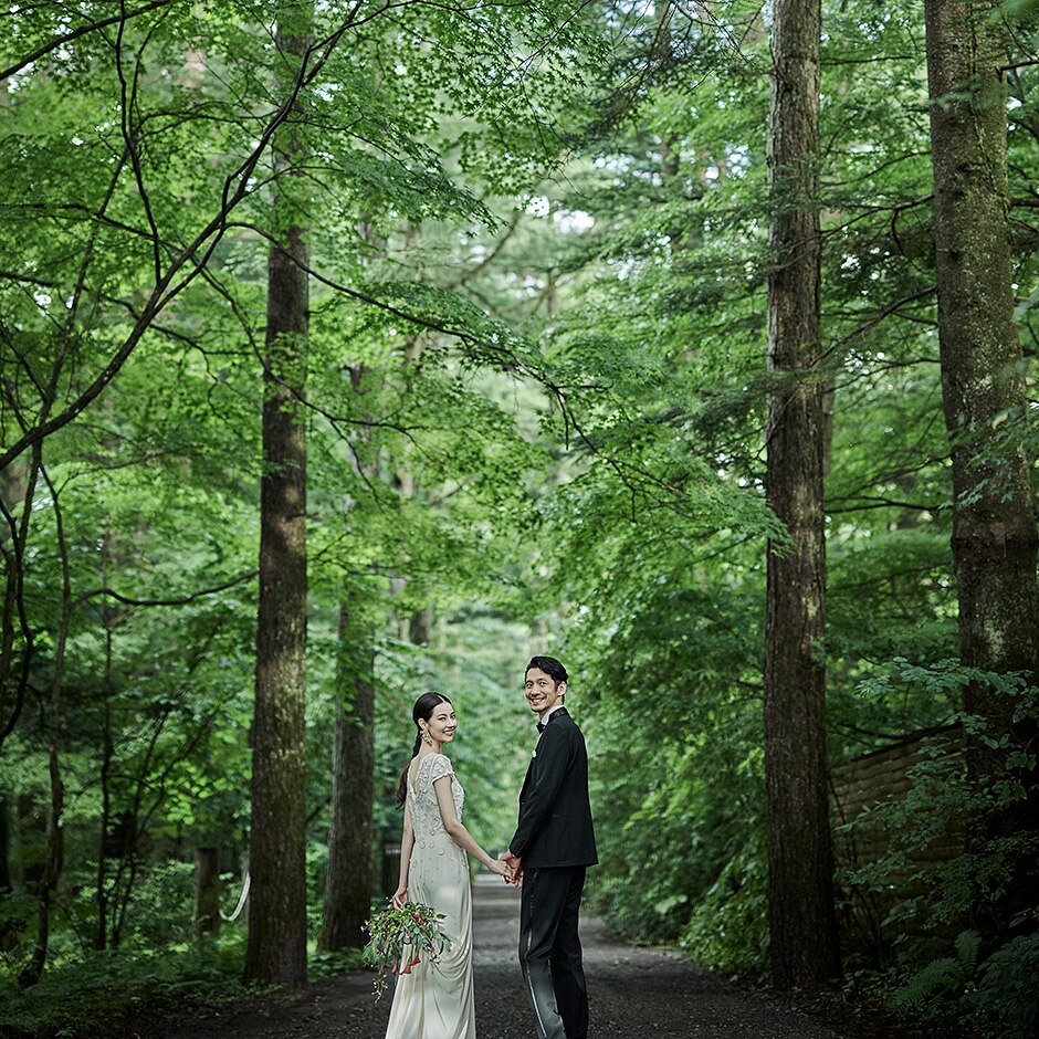 軽井沢らしい緑に包まれた空間でのフォト撮影や挙式後のウェルカムパーティーも -