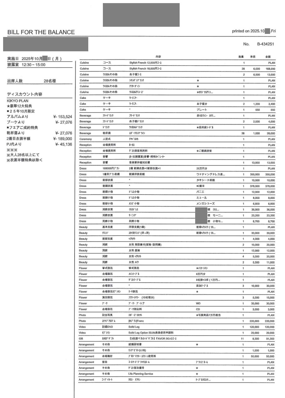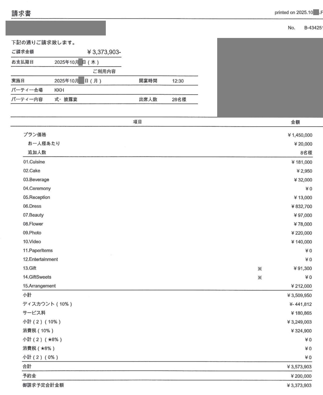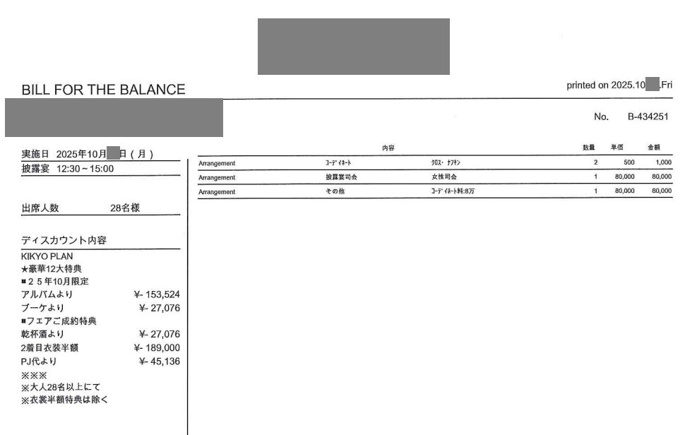 ※投稿された金額情報は、日取り、申込みのタイミングや会場の空き状況等によって異なるため、最終費用明細の項目や金額をもとにした、式場との価格交渉や追加サービス等の要望はご遠慮ください。