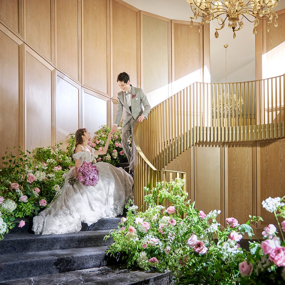 大階段でのフラワーシャワーなど主役を引き立てる演出が揃う。希望を形にしてくれるスタッフ力にお任せを。