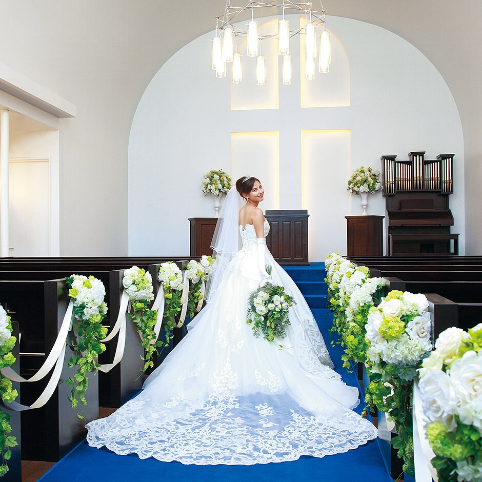 県内でも珍しい、青いバージンロードが印象的なチャペル