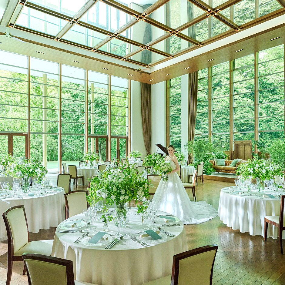 全天候対応の全面ガラス張りのチャペルは緑に囲まれた空間 -