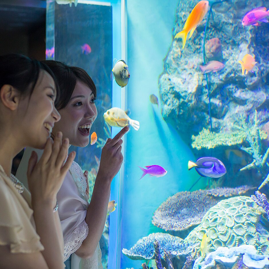 - スタッフより「水族館挙式の他、レストランでの挙式も可能です。お気軽にご相談ください。また、館内直結のホテルでは宿泊もできますので、おふたりやゲストの皆様もぜひご利用ください」