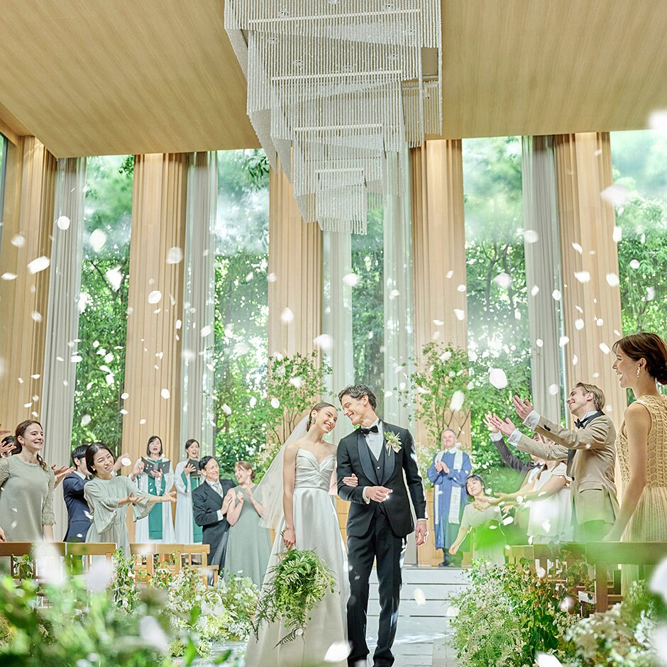 開放的で光の差し込むチャペルで、おめでとうの拍手とお祝いのフラワーシャワーに包まれて -