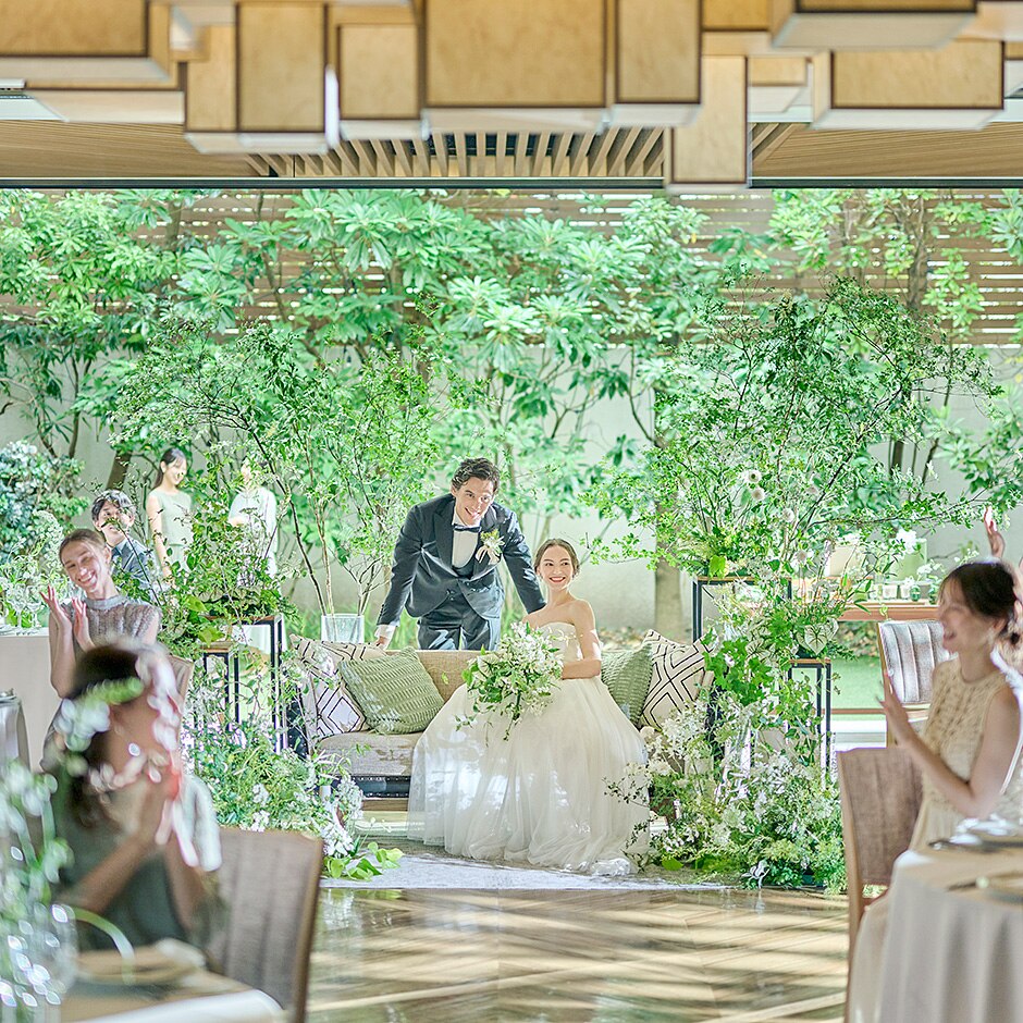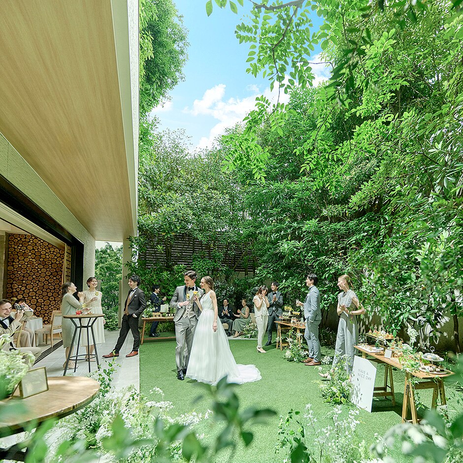 パーティ会場とつながるガーデンテラスで、緑に包まれるひと時を