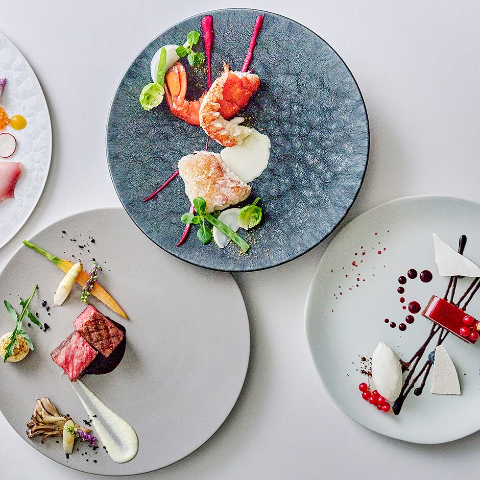 旬に合わせて、年に4回一新される料理。当日振る舞われるのは、シェフとふたりが打合せを行いアレンジを加えたオリジナルコース。オープンキッチンから食事の進み具合も確認し、1品1品を最高の状態でお届け。