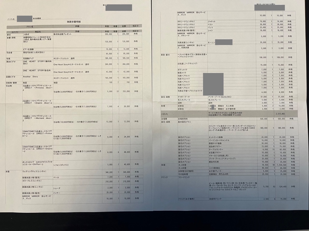 ※投稿された金額情報は、日取り、申込みのタイミングや会場の空き状況等によって異なるため、最終費用明細の項目や金額をもとにした、式場との価格交渉や追加サービス等の要望はご遠慮ください。