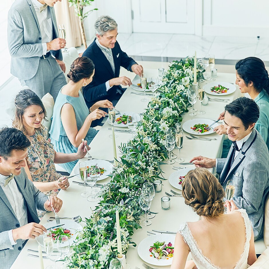 ゆったりとお食事と会話を楽しむ会食パーティ。お二人にちなんだオリジナルの一品もオーダーできる。