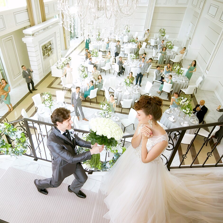 豪華なシャンデリアがきらめきを放ち、会場内には花嫁憧れの大階段を備えられている。白を基調としたスタイリッシュな空間なので、ふたりのカラーに染め上げて