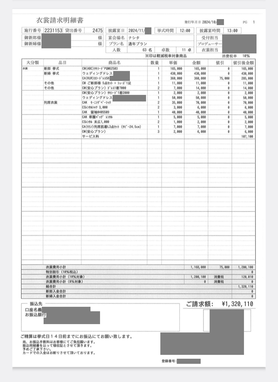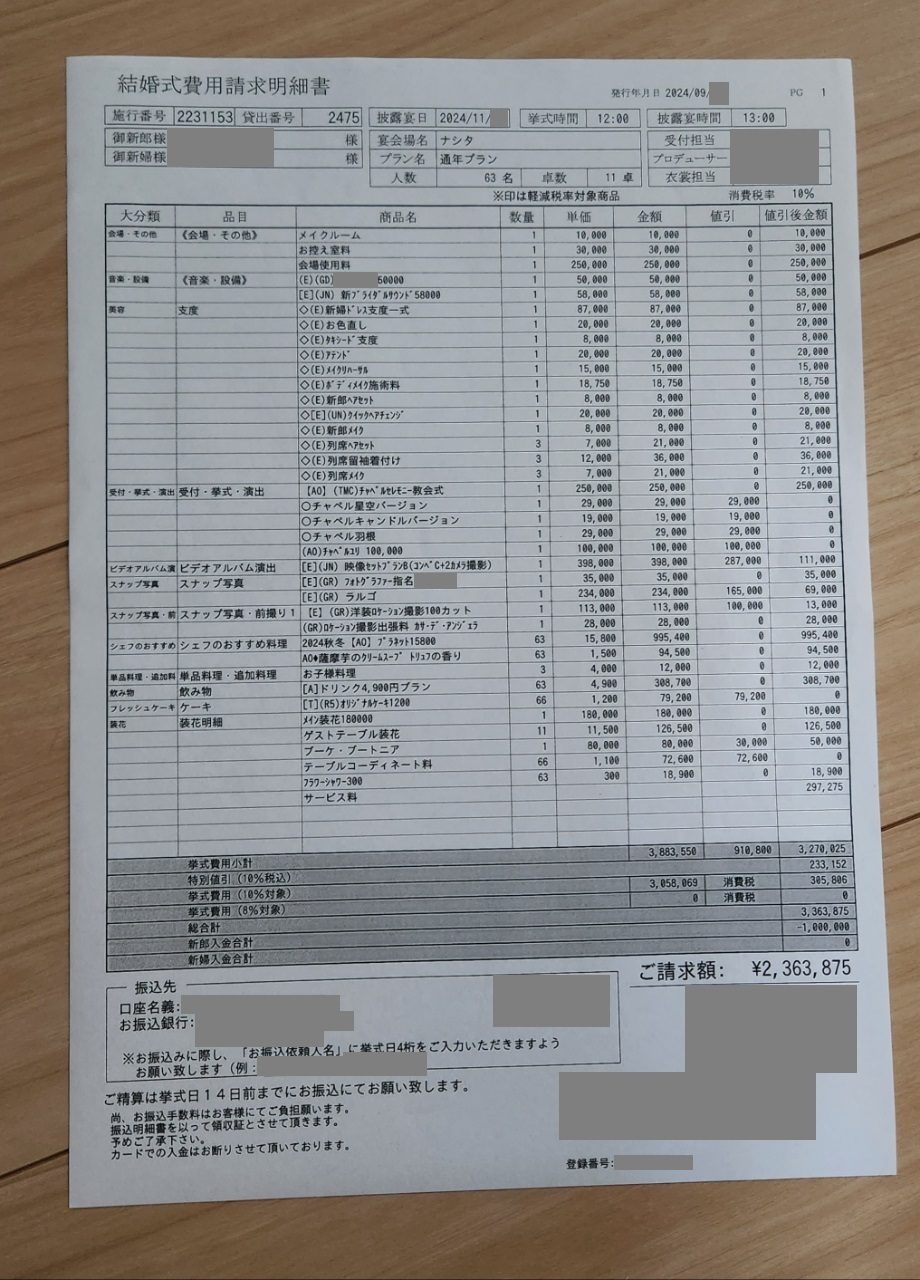 ※投稿された金額情報は、日取り、申込みのタイミングや会場の空き状況等によって異なるため、最終費用明細の項目や金額をもとにした、式場との価格交渉や追加サービス等の要望はご遠慮ください。