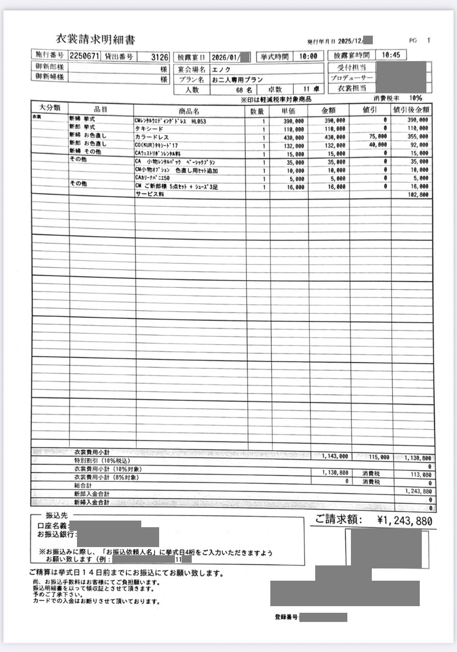 ※投稿された金額情報は、日取り、申込みのタイミングや会場の空き状況等によって異なるため、最終費用明細の項目や金額をもとにした、式場との価格交渉や追加サービス等の要望はご遠慮ください。