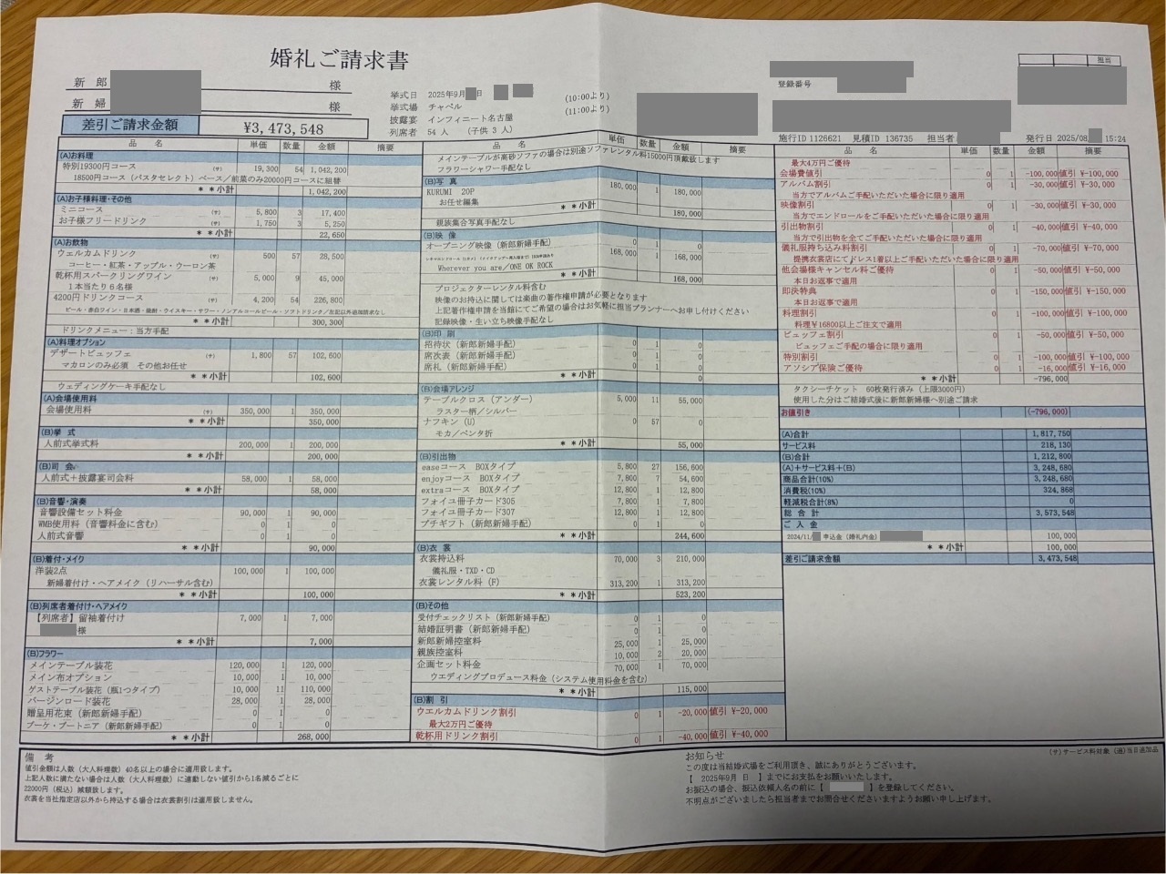 ※投稿された金額情報は、日取り、申込みのタイミングや会場の空き状況等によって異なるため、最終費用明細の項目や金額をもとにした、式場との価格交渉や追加サービス等の要望はご遠慮ください。