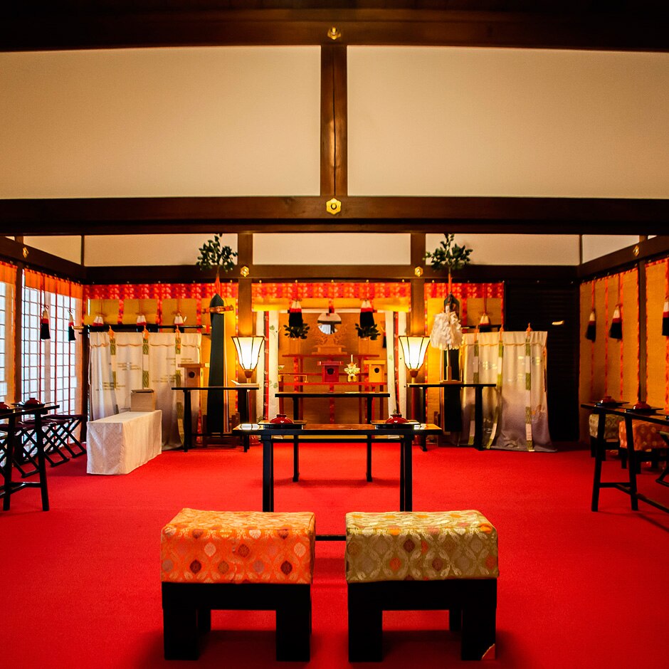 重要文化財の社殿で婚礼の式を執り行う。悠久の歴史を物語る重厚な趣が満ちている。