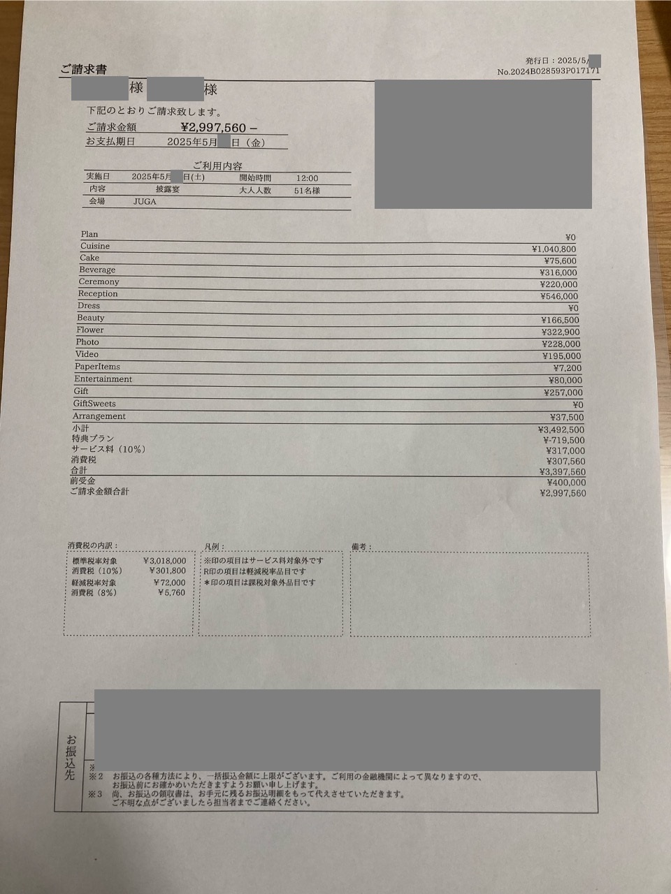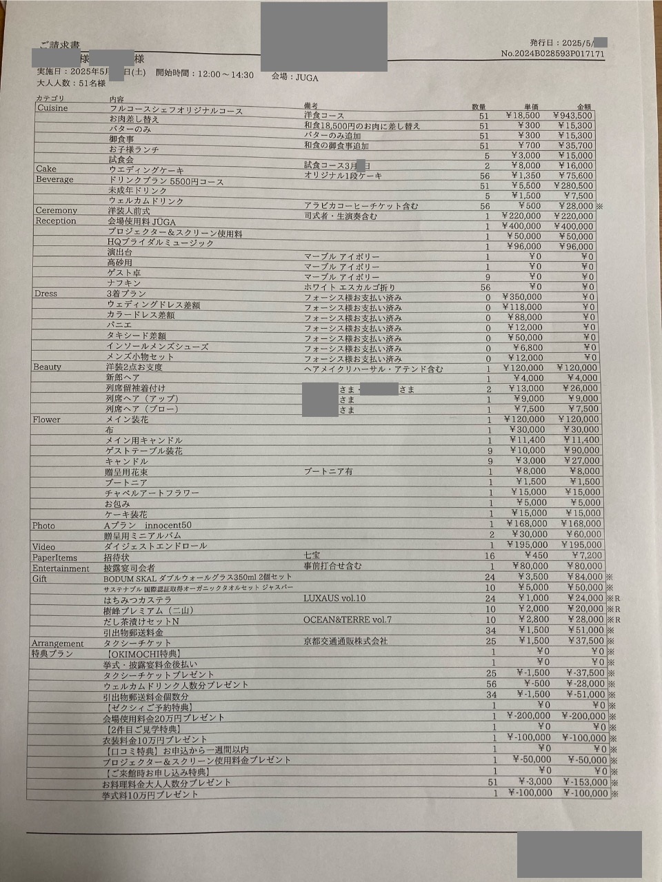 ※投稿された金額情報は、日取り、申込みのタイミングや会場の空き状況等によって異なるため、最終費用明細の項目や金額をもとにした、式場との価格交渉や追加サービス等の要望はご遠慮ください。