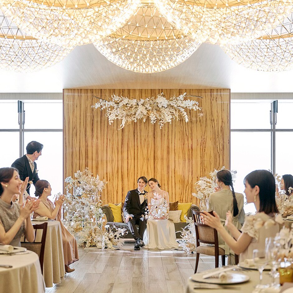 ゲストに囲まれて幸せに満ちた時間を過ごしましょう。おふたりのお席もソファや高砂など自由自在に。 -