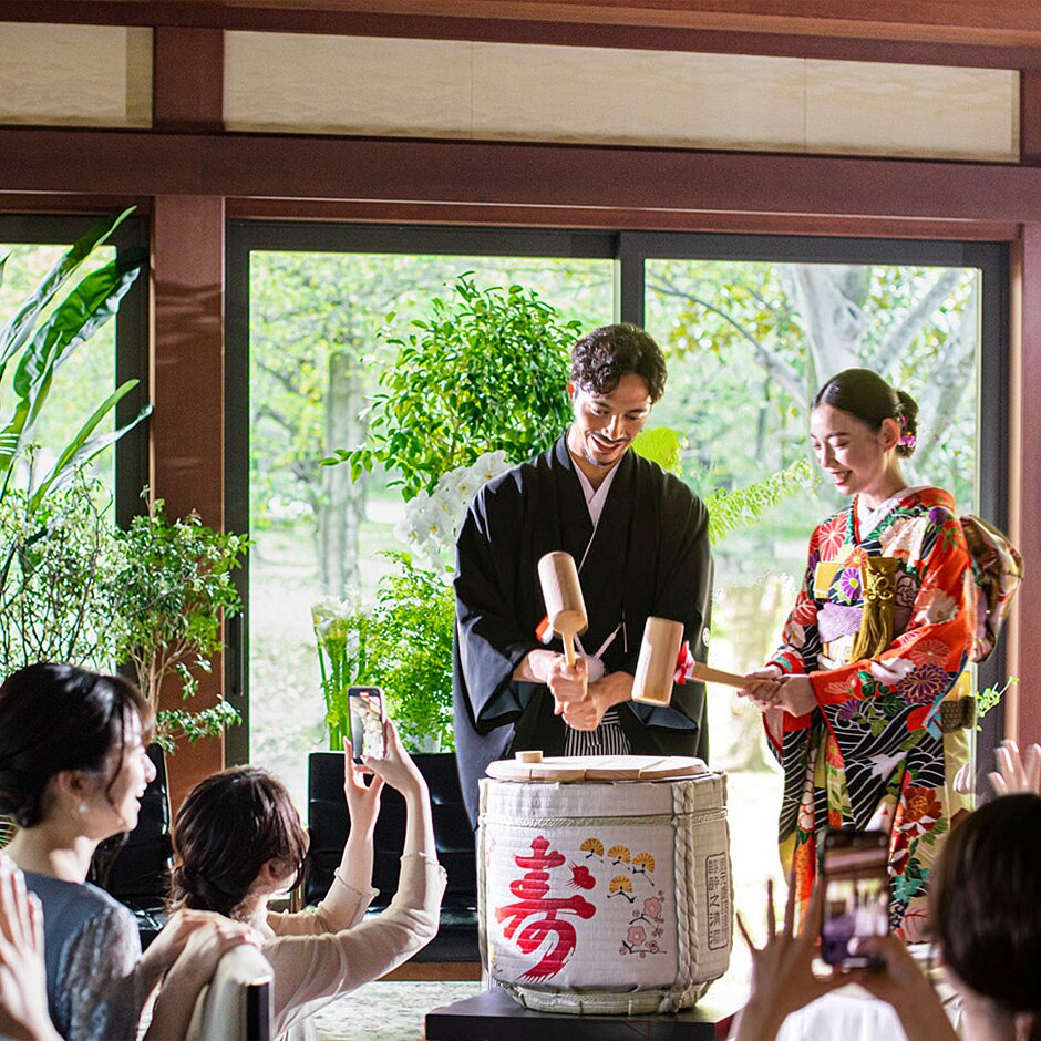 1日2組限定で貸切にできるから、ふたりらしさやこだわりをちりばめた自由なパーティが実現。和太鼓や鏡開きなど演出を取り入れれば、記憶に残る印象的なウエディングに。みんなでワイワイと笑顔で集うひとときを