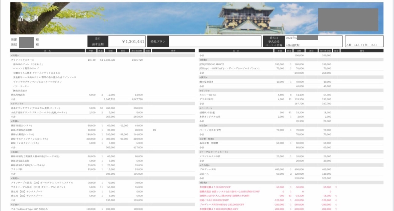 ※料金実例では申込金などを含む会場に支払った"総額"を表示しています。また、料金明細画像の項目名をもとに独自の基準で分類しています。