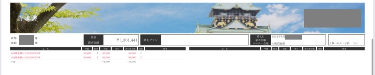 ※投稿された金額情報は、日取り、申込みのタイミングや会場の空き状況等によって異なるため、最終費用明細の項目や金額をもとにした、式場との価格交渉や追加サービス等の要望はご遠慮ください。