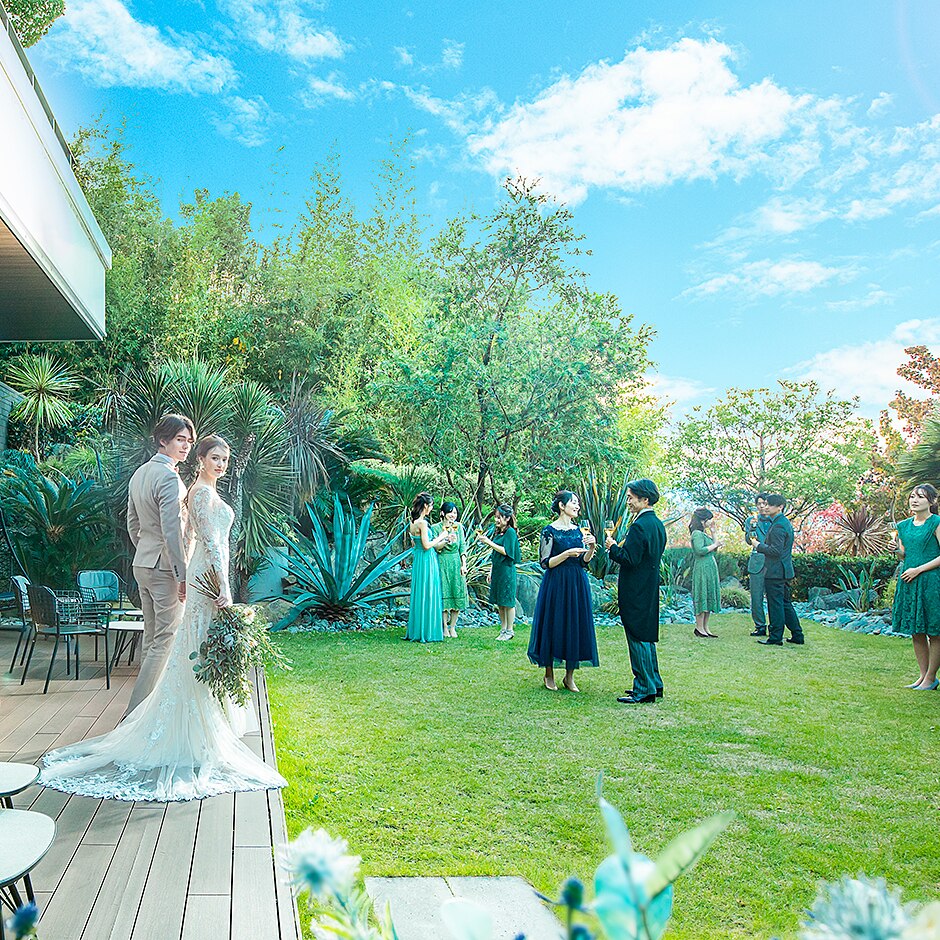 屋上テラス【Air】では絶景のアフターセレモニーが人気。自然と調和するカジュアルパーティは、パノラマビューが印象的な会場【Kit】。広いテラスが自由に使える会場【Bar】。少人数向けの【INDIGO】の3つを用意