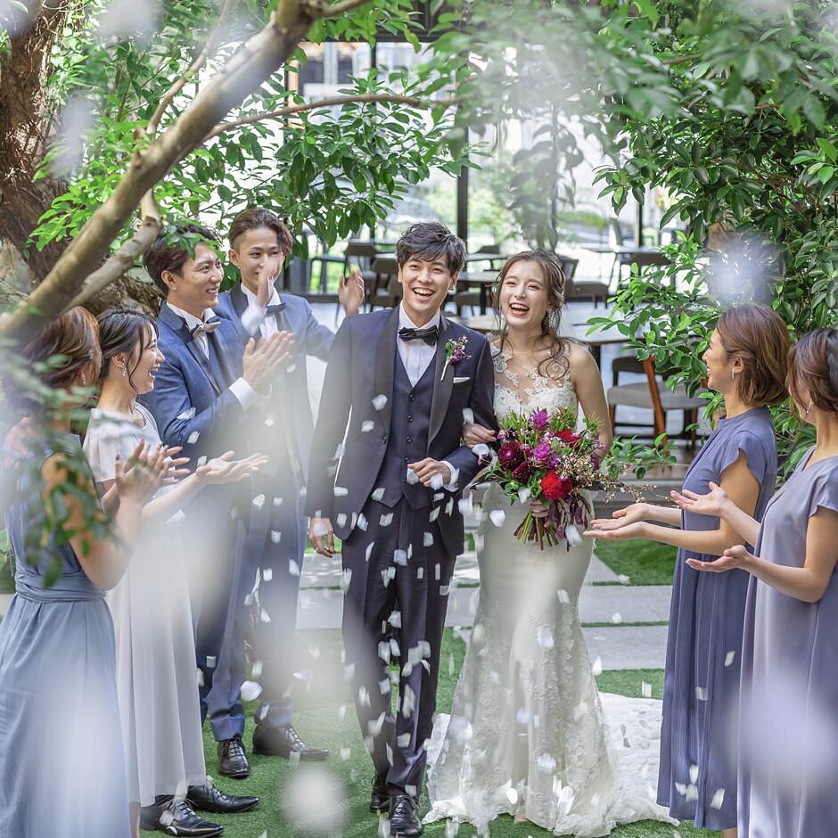 ゲストからの祝福のフラワーシャワーと歓声の中新たな一歩を踏み出す