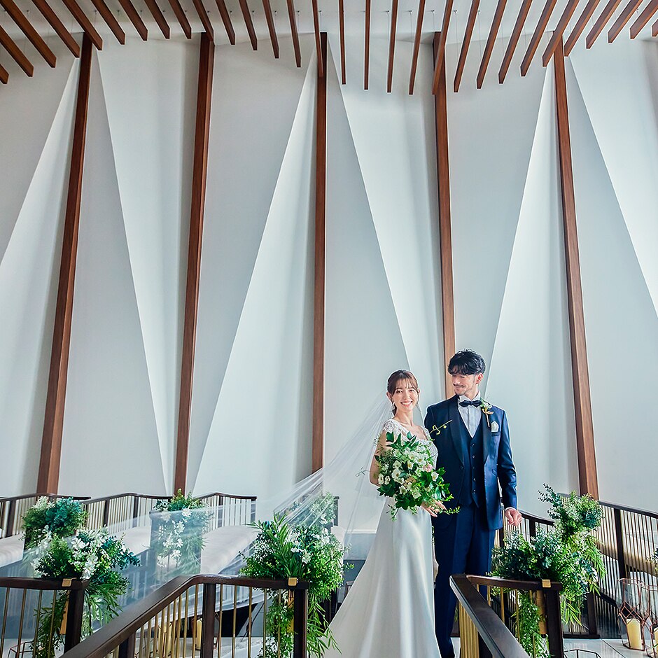 自然の中に身を置くような開放感あふれるチャペル。110名着席できる広さがあり、天井高は7mと見上げるほど。宗教色の薄いニュートラルな挙式ステージは、教会式や人前式、和の挙式などふたりらしい誓いを選択できる