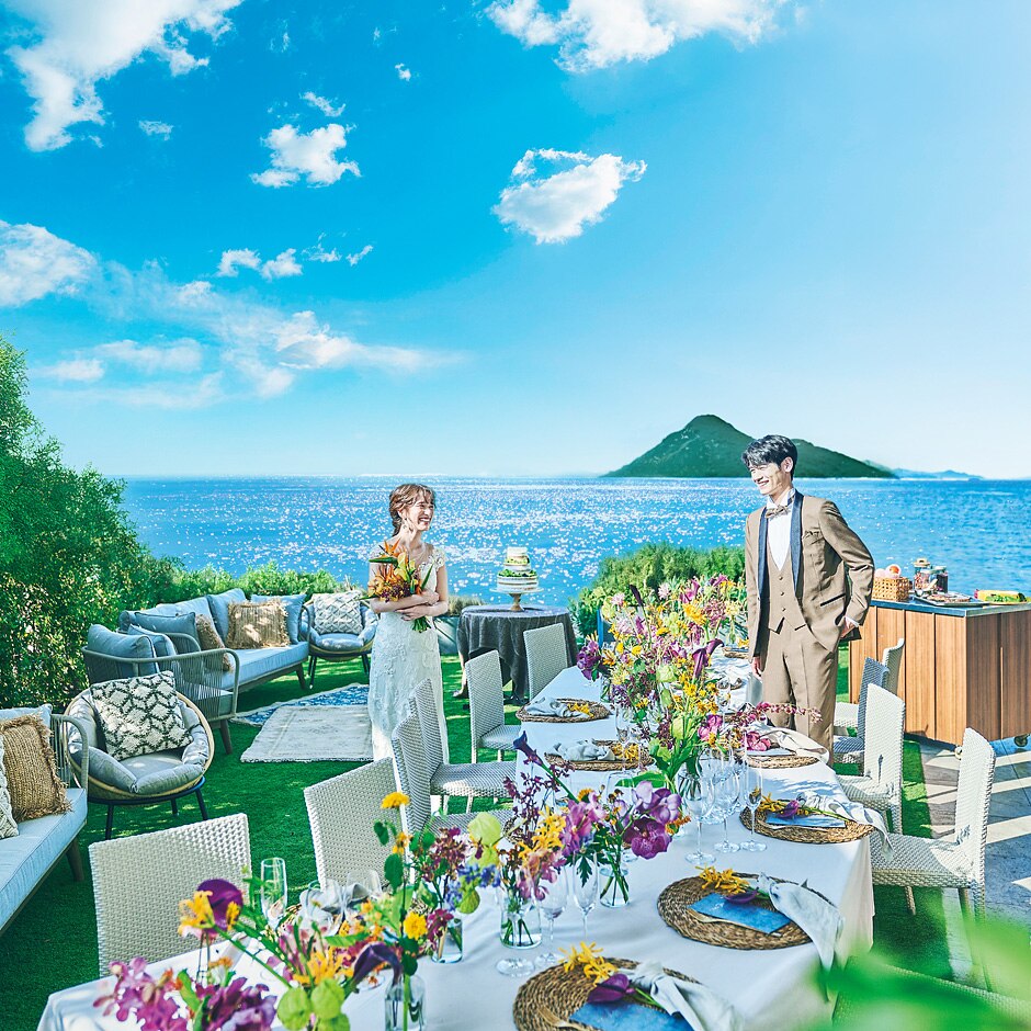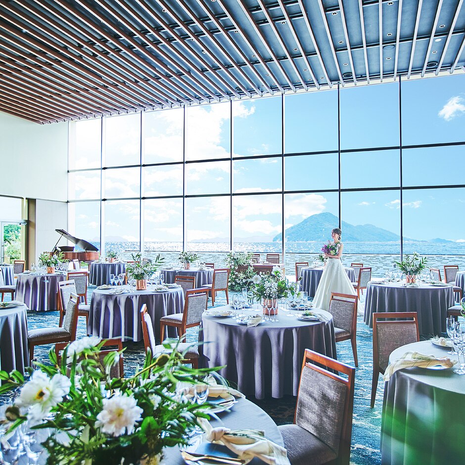 オーシャンパノラマが広がるパーティ会場。どこよりも美しく優雅な祝宴を