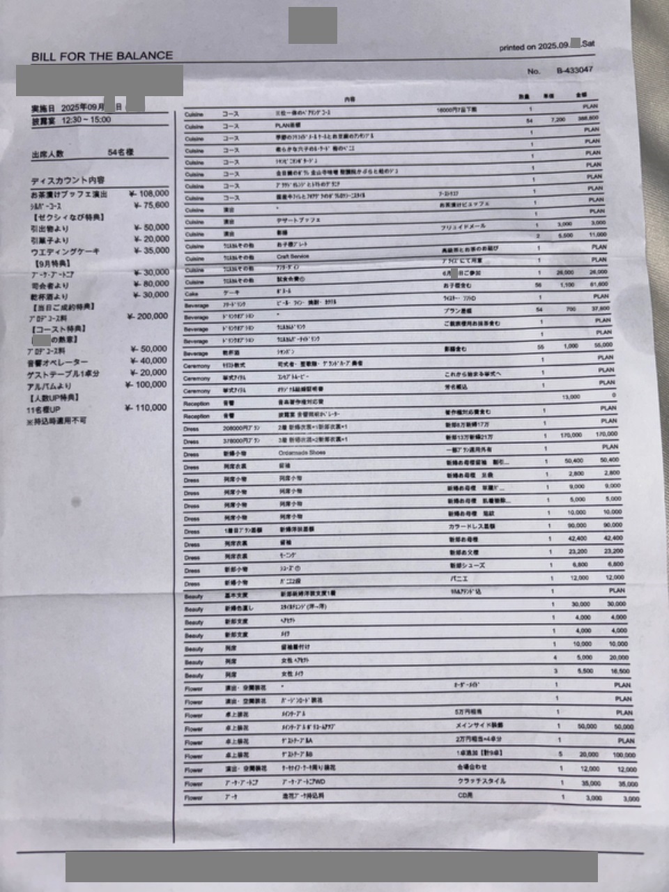 人数が当初の予定よりだいぶ増えたのもありますが、最初の見積もりから料金は倍以上になってしまいました。
