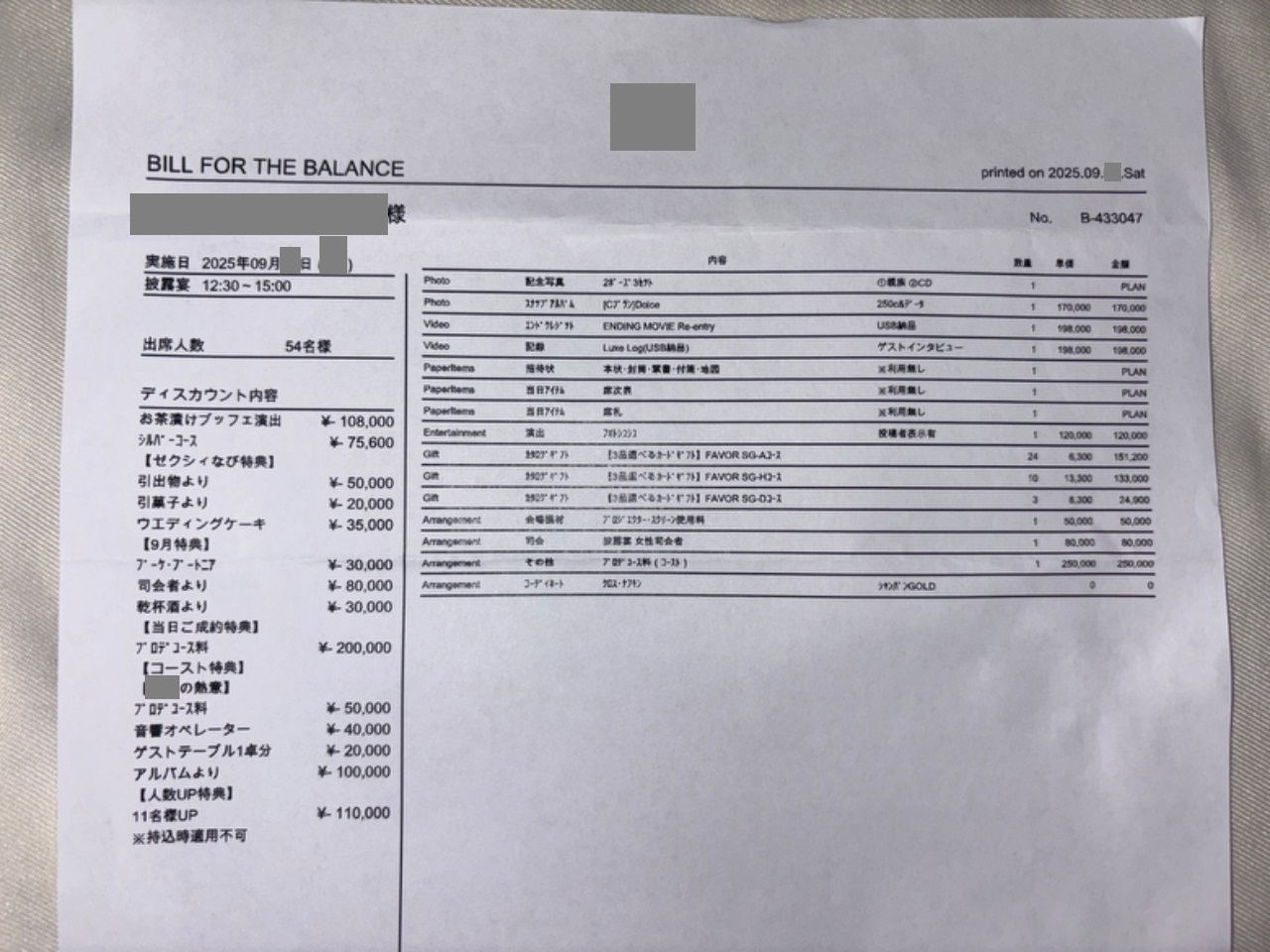 ※投稿された金額情報は、日取り、申込みのタイミングや会場の空き状況等によって異なるため、最終費用明細の項目や金額をもとにした、式場との価格交渉や追加サービス等の要望はご遠慮ください。