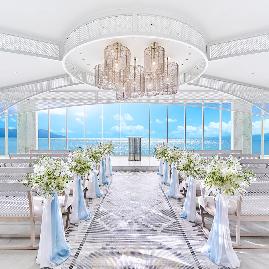 会場名「オリゾンブルー」の由来にもなっている碧い水平線を臨むチャペル。110名の大人数を招いてのセレモニーもゆったりと過ごすことができる*