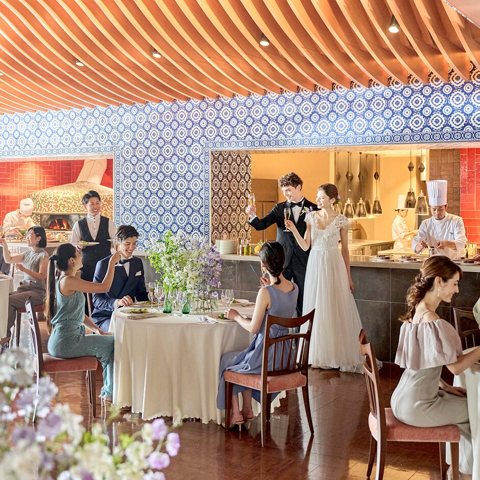 大きな窓から陽光が入る明るいパーティ会場は、本格窯付きのオープンキッチン併設で出来立ての料理をゲストに届けることができる。ひと皿が完成していく様子はひとつの演出としても楽しめ、ゲスト満足度も高い