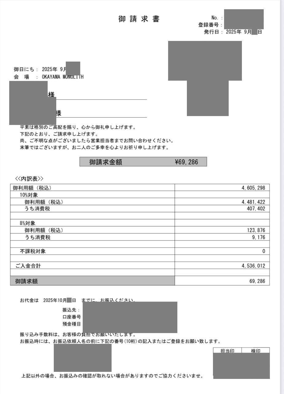 ※料金実例では申込金などを含む会場に支払った"総額"を表示しています。また、料金明細画像の項目名をもとに独自の基準で分類しています。