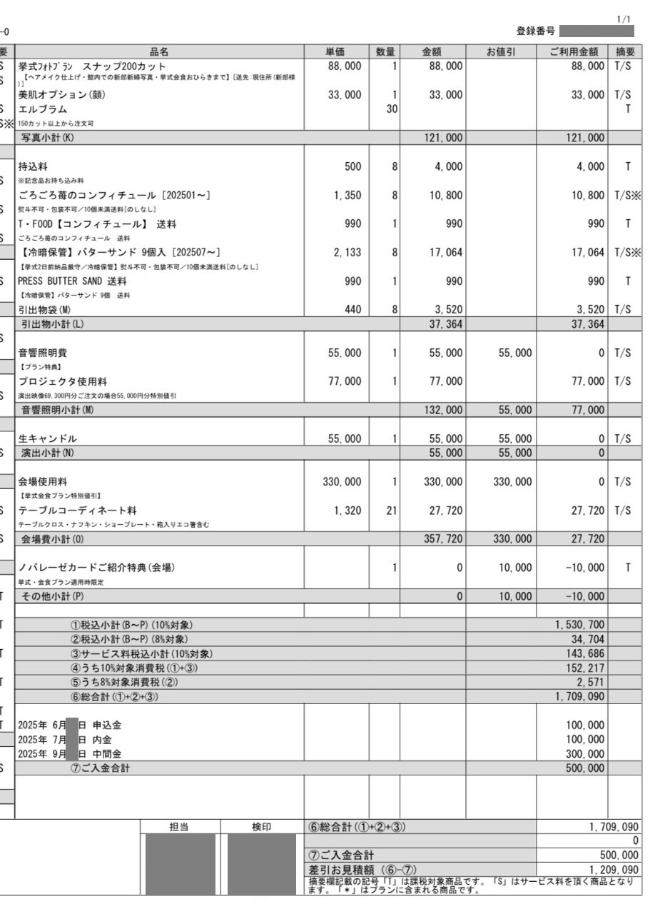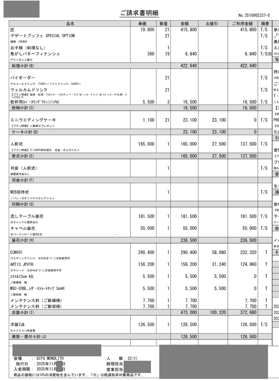 ※料金実例では申込金などを含む会場に支払った"総額"を表示しています。また、料金明細画像の項目名をもとに独自の基準で分類しています。