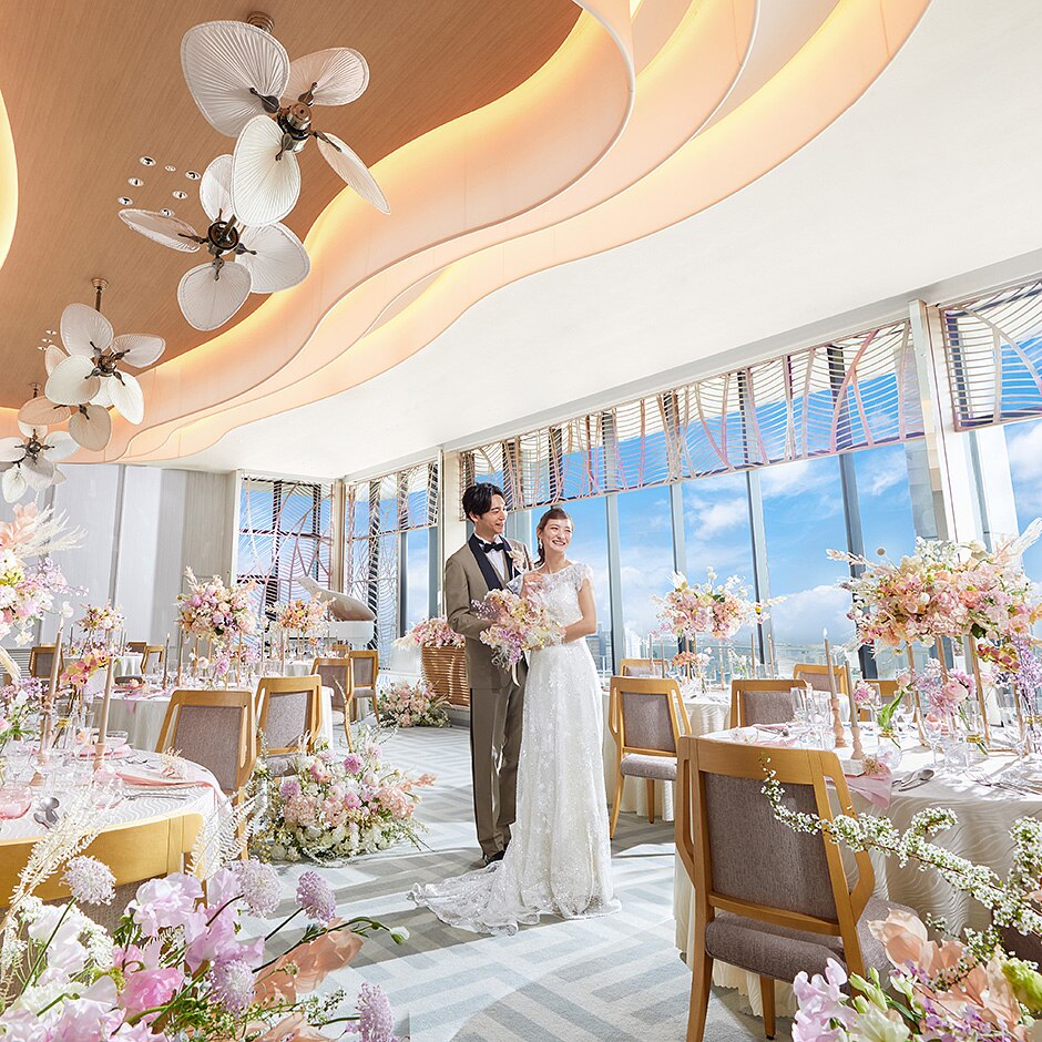 大きな窓から注ぐ陽光はふたりを引き立てるスポットライトのよう。幸せな旅立ちをイメージした気球のオブジェに見守られ、大空を眺めながらのセレモニーはいつまでも素敵な想い出になる