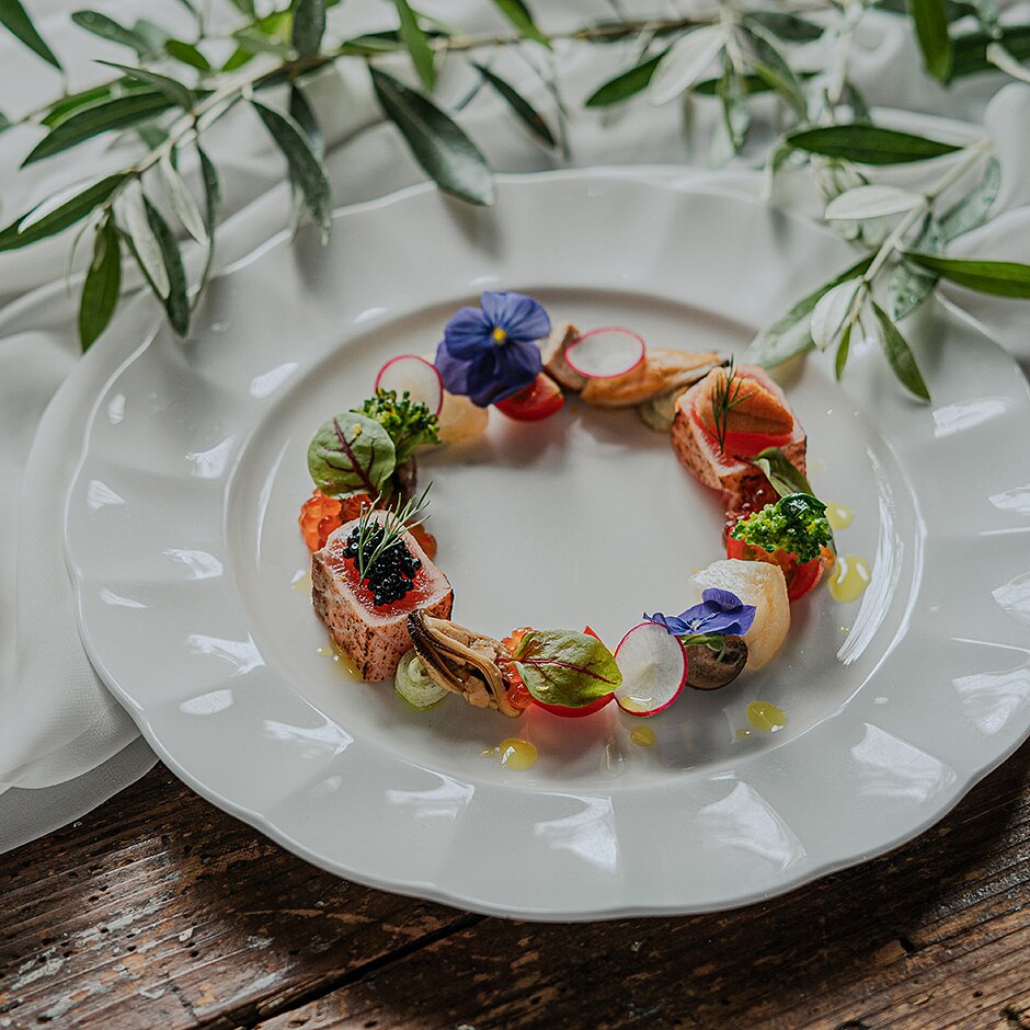 熟練のシェフが“ウエディングコンセプト” を元にオリジナルメニューを考案し、想いをヒアリングしながら一緒にメニューを設計。幸福な日を彩る瀬戸内フレンチスタイルでゲストの目と舌を贅沢に楽しませてくれる。