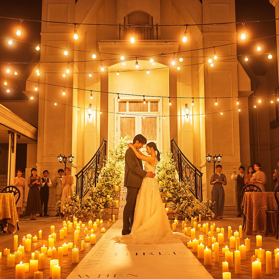 当日はエントランスから白亜のチャペル、バンケット、ガーデンまで1組で全館貸切OK!ふたりの別荘へゲストを招くような優雅なもてなしが叶う。さらに昼はもちろん、黄昏時からのナイトウエディングも思い通り!