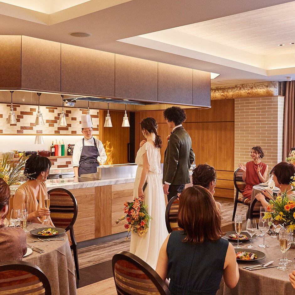目の前で行われるフランベの演出にゲストからの歓声が!披露宴という大切な時間の中「料理も演出の一つ」としてみなさまに楽しんでいただけます