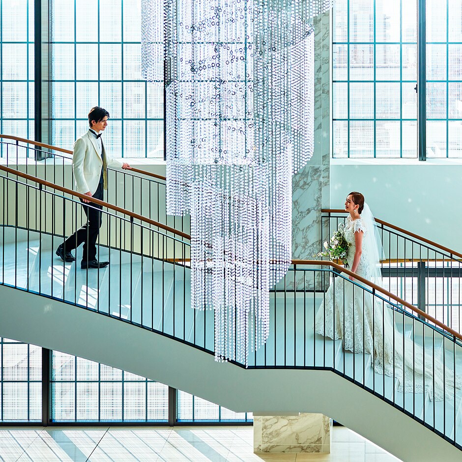 大きなシャンデリアが目印の螺旋階段は、アフターセレモニーだけでなくフォトスポットとしても人気の場所。